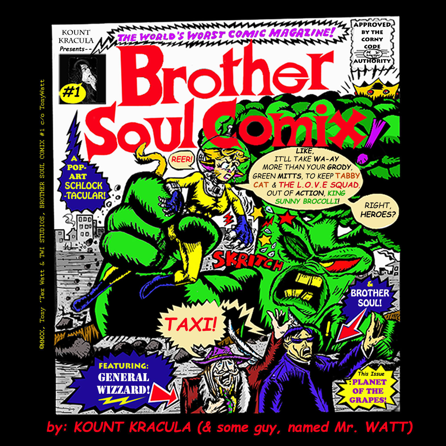 Continuing from Issue #0 (Zero)...the zany gang of Brother Soul Comix characters are back by Popular Demand (Melvin Popular, from Cleveland, Ohio, demanded it)! All said, this is the 3rd picture book, for the (fictional) team of "What's Inside Your Gut, Shmut?": Illustrator/co-plotter: Mr. Anthony ('Tony' ) Watt (aka: the kooky, benevolent author/artist/storyteller & TV Horror Host: ' Kount Kracula'; who lives in [and lurks] Hollyweird, Canada )! This 'Brother Soul Comix' picture-book #1, is the second, in a sanguine, satirical series of upcoming sardonic stries; in the cacophonic "Kount Kracula Picture-Book" concatenation. Along with the return of Brother Soul & General Wizzard-- this issue also has the first phantasmagorical physical appearance of Tabby Cat & the nebbish Agent Ron!) The 'Brother Soul Comix ' ( fantasy/sci-fi, weird fiction-based) picture-book series -- . is based on characters, from Anthony Watt's : 'BROTHER SOUL'S Vintage Radio Variety Theater' podcast series ( about 'Brother Soul', a mellow-ish, fun-lovin', equable, part-time, super-heroic, mercenary, crooner & gambling millionaire priest with wings, who, with his co-opted, multi-funded Soul Mansion/Fortress of Soul-itude -based motely crew of quirky peace-keepers & quirky adventurers [Anastasia Huckleberry, Tabby Cat, General Wizzard, Freckles, Queen Shadoobi, Agent Ron ..etc.]), fighting against homicidal kaiju MONSTERS & invading bug-eyed ALIEN forces; for the clandestine, multi-national, North America-based L.O.V.E. (Labour Ops for Volunteer Enforcers) Agency. This issue brings back the L.O.V.E. Squad's mysterious Brother Soul (aka: the’ "Winged Crusader") -- a Weird Hero.. for Weird Times! In this super-groovy Weird Fiction Funnybook! This publication's Creator(s) & the wild bunch of drunken, medicated, overfed, long-haired, leaping gnome & sparkly pixie nun assistants ( at our office in : the 'TWI Studios Mudhole'), hope you cultured comix readers enjoy this funky, fun-filled picture book!